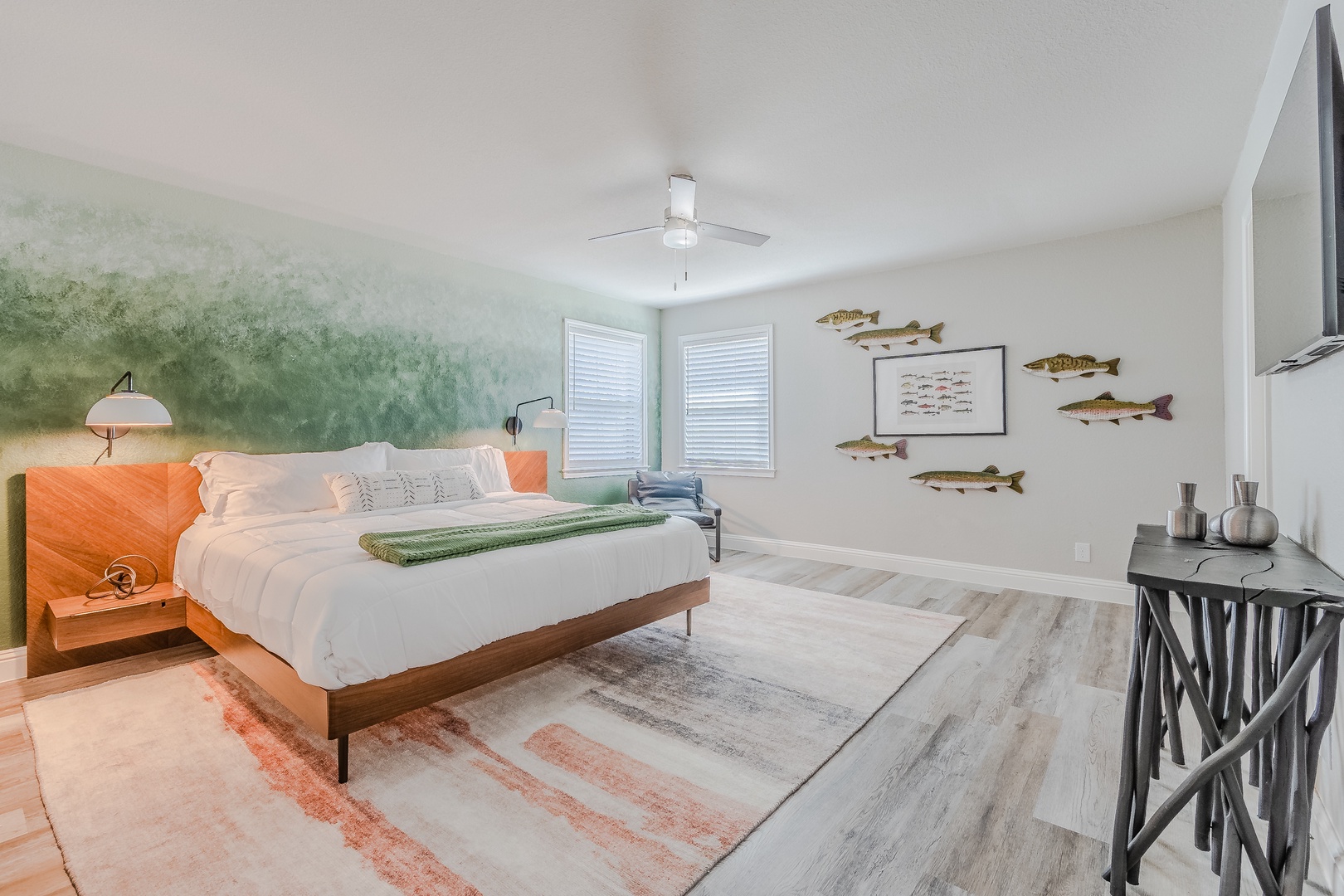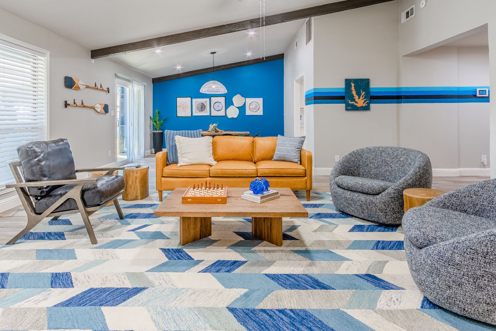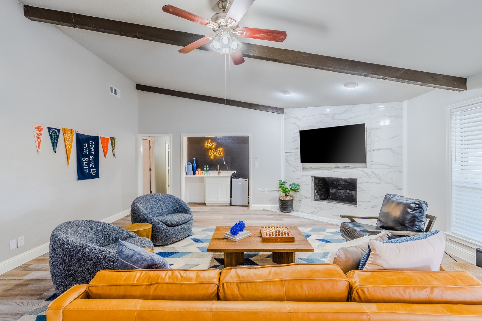 Huge couch, chairs, modern lake theme design, Smart TV, and a fun bar area