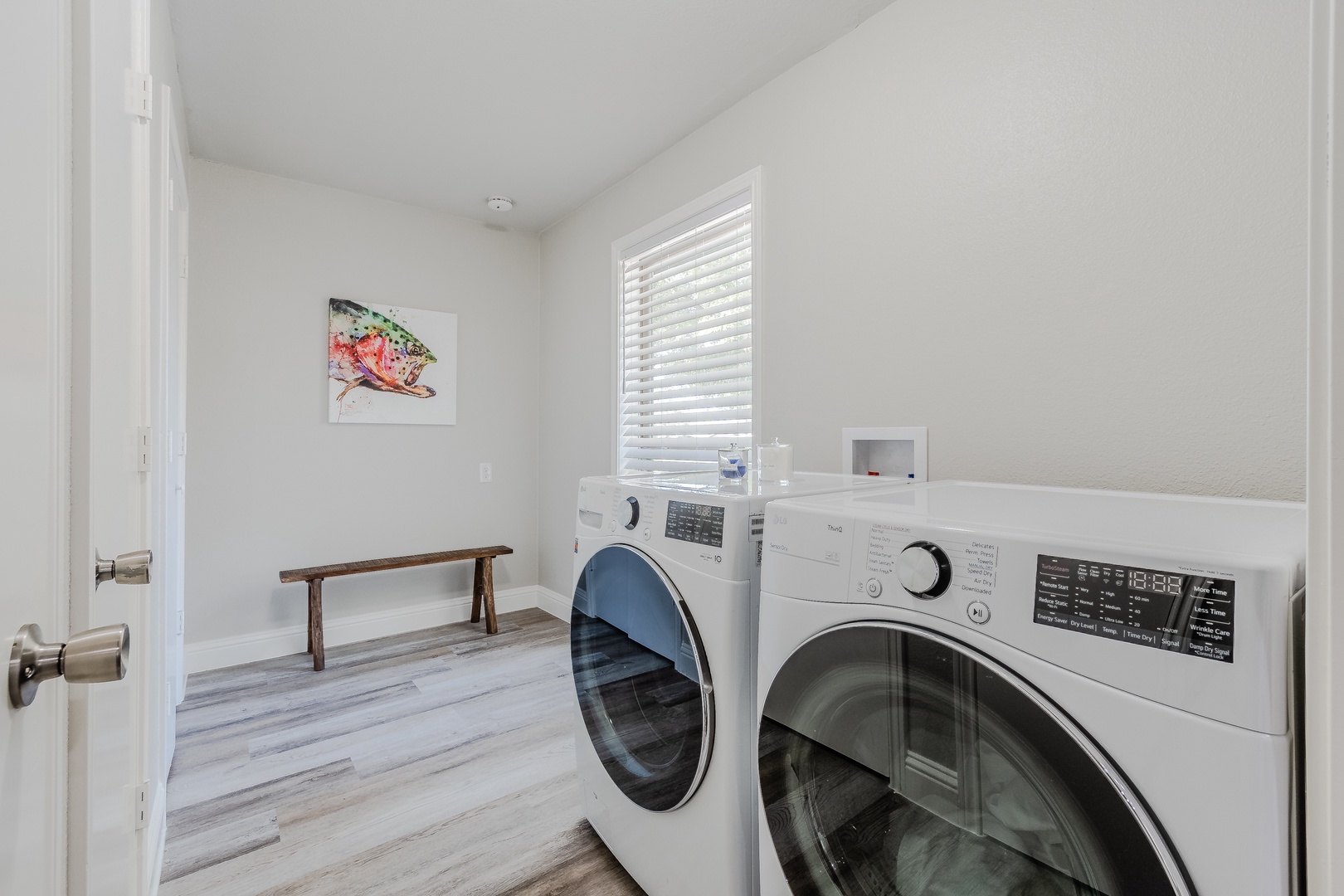 Starter supplies provided: paper towels, toilet paper, K-Cups, sugar, creamer, toiletries, dish soap, and laundry detergent.